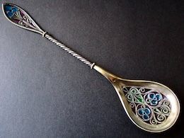 教会のステンドグラスを思わせる多色使いが美しいプリカジュールエナメル(透胎七宝)のスプーン。実用の食器ではなくノルウェーの伝統工芸品あるいは有名作家の作品として鑑賞向きに制作されたものである。繊細な細工であるが状態は良好。光を透すエナメル越しに変化する色の表情を楽しみたい。