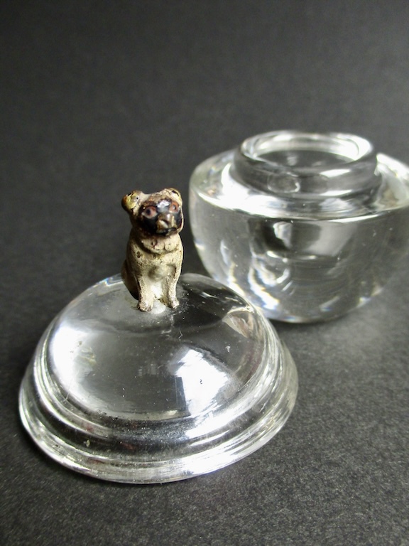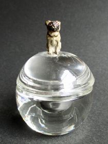 16世紀大航海時代のオランダに中国から渡ったパグ犬は、オランダ王室に寵愛され繁殖されるようになる。以来ヨーロッパの王侯貴族の愛玩犬として珍重され、愛嬌ある姿は工芸品の意匠としても大変好まれた。厚みのあるクリスタルガラスの乳歯ボックスは、ミニチュアサイズのお座りしたパグ犬の摘みの上蓋が特徴的である。子どもの成長を記念する乳歯ボックスでヴィエナブロンズ付きは珍しい。