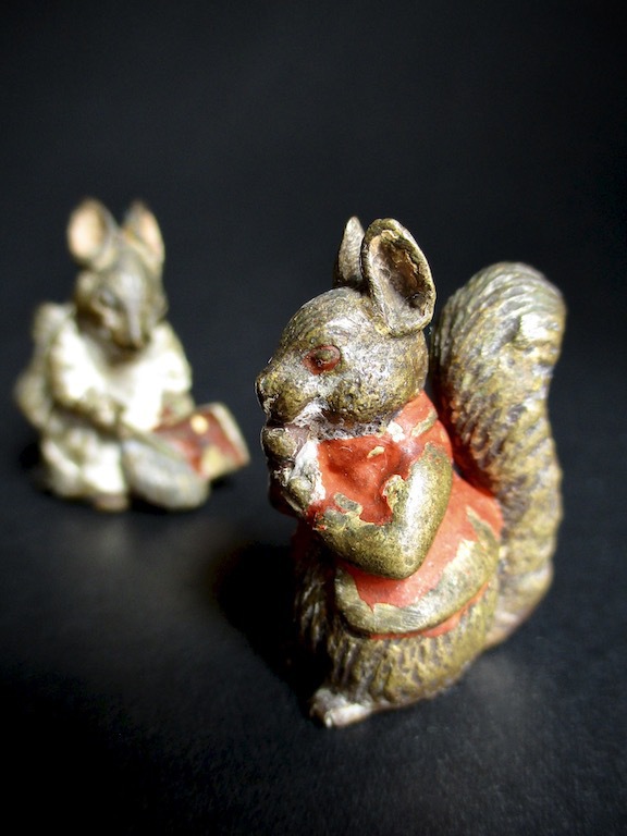 イギリスの絵本作家ビアトリクス・ポター(1866-1943)が1911年に発表した"The Tale of Timmy Tiptoes(つまさきティミーのおはなし)"の主人公はいいろりすティミーである。現代でも主要キャラクターのモデルは、Bergmannの原型を1960年代に引き継いだ会社による近年の正規品だけでなく新旧多様なコピー品も市場に出回っている。この作品は多くのエナメルの剥落が見られるが色彩と質感が感じの良い戦前のものである。