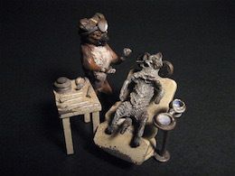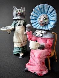 台の上のティーカップと傍らに佇む猫の一体作品。台の木目やカップに満ちたお茶もきちんと表現されている。前足をなめる猫はルーペで見ると赤い舌が確認できる芸の細かさである。2匹とも白いお腹の猫。