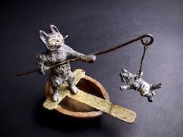 胡桃の殻のボートに乗った猫が仔猫を竿に吊るして泳ぎの練習をさせるユニークなブロンズ像。海水パンツとアームリング(腕の浮き輪)を装着した仔猫の表情が絶妙で可愛らしい。古い作品にもかかわらず猫のヒゲや顔のエナメルはもちろん、欠損や傷みがちな仔猫や竿のパーツまで状態の良い珍品となる。