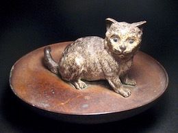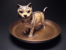尻尾を立てたご機嫌立ち姿の猫のついた、小物を置くための小さなトレイである。猫の鼻先周辺にエナメルの剥げがあるほかは良い状態である。トレイは元来、銀鍍金されていたが鍍金が薄れブロンズ色が出ている。刻印はないが、原型はBergmannと思われる。