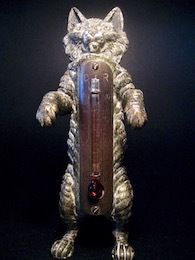赤い液体の入った棒状ガラスの温度計を腹に取り付けた猫の、存在感ある迫力サイズの19世紀作品。尻尾と後ろ足で安定して直立する猫の前足(うらめしやポーズ)が可愛らしい。猫目のエナメルがきれいに残り表情が良い。刻まれた温度計の目盛単位の摂氏(C、セルシウス度)と当時フランスやドイツで使用され現在は廃れた列氏(R、レオミュール度)が時代を感じさせる。