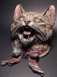 頭を低く背中を丸めて尻尾を膨らませた、猫の威嚇ポーズ。耳を後ろに倒し目を見開いて牙を剝くブロンズ像からは、今にも「シャー」と威嚇の鳴き声が聞こえそうな出来映えである。可愛い表現の多いヴィエナブロンズの猫の中では非常に珍しいモデルである。怒った猫の鼻の皺、牙や口の中、毛を逆立て手足に力を入れた筋肉からは原型師の気迫が感じられる。