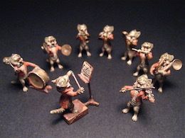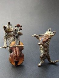 ヴィエナブロンズの動物の楽団は、音楽の都ウィーンにふさわしく人気のある主題のひとつで、現代においても作り続けられているが、時代や流行により、声楽家がいたりジャズバンドだったり様々である。この作品は、譜面台を前にタクトを振る指揮者をはじめとする猫9匹のオーケストラである。元から9匹であったかは不明だが、アンティーク作品がこの数のセットで市場に出ることは非常に珍しい。