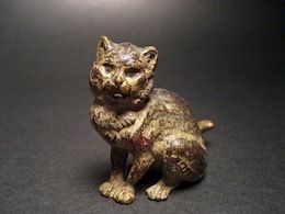 しなやかな筋肉を感じさせる造形、パンサー系の精悍な顔立ちの猫。比較的珍しいモデルである。エナメルの剥落箇所に見られる赤茶色の下地顔料が特徴的な、マイナー工房の作品と思われる。若干サイズの大きな作品とはいえ、両足二箇所の刻印も珍しい。