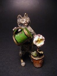 猫がじょうろで鉢植えパンジーに水やりする複雑な構図のブロンズの重みを、猫の二本脚と尻尾、鉢植えで上手にバランスをとって作り上げた作品。一部エナメルの剥落が見られるが、細かなブロンズパーツに欠損や傷みが無い。