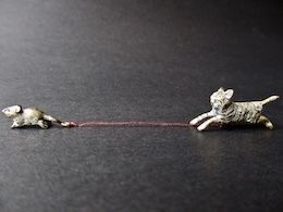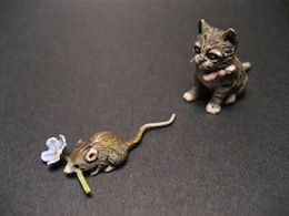 極小ミニチュア作品。ネズミや猫の尻尾にダメージも見られず良い状態である。2匹がばらけないよう、猫の腹にネズミの尻尾と糸で繋ぐためのカンが付いた珍しい仕様である。エナメルの剥げはあるものの猫のヒゲや表情も残る良い状態である。