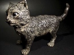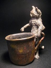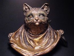 ガラス義眼を嵌めた猫は、蝶番付き頭部を開けてマッチを納める卓上用の灰皿である。19世紀後期は、葉巻やパイプ煙草がポピュラーであった。現代のシガーボウルもしくはパイプレストの役目を果たしていたと思われる。