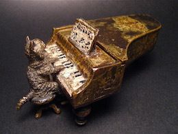 楽器を演奏する動物作品は、音楽の都ウィーンにふさわしく人気のある主題のひとつで、現代においても作り続けられている。楽譜を前にグランドピアノを弾く猫は、英国登録番号入りの卓上マッチ入れで、ピアノの屋根(蓋)を開けるとマッチを収納するくぼみとマッチを擦る刻みがある。ピアノ側面に記された"BRINSMEAD"は、ヴィクトリア時代に一躍有名となったロンドンのピアノ工房で、この作品がイギリス市場向けに特別に制作されたものであることが分かる。
