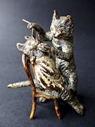 ウィーンで現在も作られているヴィエナブロンズ、音楽の都らしい動物の音楽家やピーターラビットは現行品でも存在するが、床屋という主題は大変珍しい。剃刀を当てられた猫が緊張してピンと尻尾に力を入れている表現が可笑しくも可愛らしい、素晴らしい作品である。