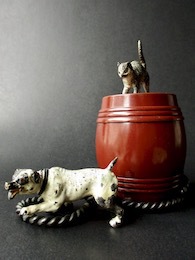 鎖に繋がれた犬の後ろから樽に乗った猫がちょっかいを出す様子が愛らしい構図。樽の蓋を開けると白い陶製のインク壺が仕込まれている。19世紀前半ネズミ狩り専門に改良された犬種のラットテリアと猫を組み合わせたアイテムは、19世紀後半それらを邸内に飼っている富裕層に人気の意匠であった。