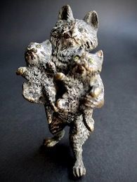 走る母猫の背中で三角帽子の仔猫がバランスをとる曲芸をしている。刻印のM.S.は Moritz Spitzとされるが、作家の詳細は不明(調査中)。存在感のある作品。