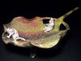 フランスアール・ヌーヴォーの影響が見られる葉の形をした、小物やカードを置くためのトレイは、マイナーな工房の作品と思われ市場で滅多に見かけることがない。星や花の模様を刻んだ日本の団扇に似せた葉の上にそれぞれ違うポーズで佇む2匹の猫というユニークなデザインである。猫の表情や毛並みは大変良く表現されている。