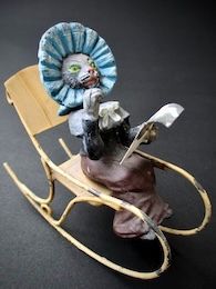 時代遅れのヴィクトリアンスタイルのボンネットとケープのおばあちゃん猫は、中空(中が空洞)のスペルター作品にだけ見られる首振り式である。作品の一部に製造段階で抜き型の形に合わせるスペルターが薄いため薄割れ穴が生じている。規格外品としてデッドストックされたものと思われる。手紙を手にしてロッキングチェアの揺れに合わせて首を振る、比較的珍しいモデル。ボンネット後頭部に3mm弱の薄割れ穴あり。