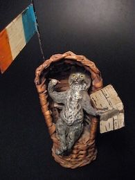 三日月の顔の上で歌う猫とマンドリンで伴奏する猫。猫たちが夜空に浮かぶ孤独な月のために音楽を奏でているのだろうか。スペルターとしては重さがあり表現も細かい出来の良い作品である。楽譜や月の縁にエナメルの剥落が見られるが細かなパーツに傷みのない状態。