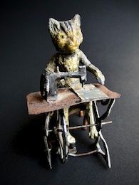 ミシン製造会社シンガーが足踏み式の実用ミシンを発売したのは1853年、19世紀後半には普及していた足踏み式ミシンで縫い物をする猫である。中空(中が空洞)のスペルター作品にだけ見られる首振り式となる。顔料の剥落と変形はあるが、ブロンズに比べ変形しやすいスペルター製であることを考えると椅子やミシンの脚の状態は奇跡的とさえ言える。