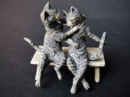 ベンチに腰掛け愛を語らう恋人同士の猫。抱き寄せようとする猫と尻尾を掴み羞じらう猫の動作を巧みに表現している。古い作品にもかかわらず猫のヒゲや顔のエナメルはもちろん、欠損や傷みがちなパーツも状態が良い。