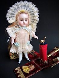 ミニョネットサイズの人形はその小ささゆえ顔の描きや義眼のセッティングがベベタイプの人形に比べて困難で、整った出来映えの作品が比較的少ない。この作品は顔の出来も良く、フランス市場を意識したシルク衣装を着けた上手のシモン&ハルビックのオールビスク型番886の後期モデルである。