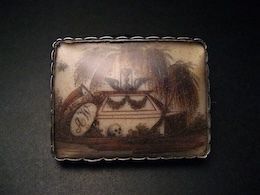 牙板にセピア色顔料と遺髪で作るミニアチュール(細密画)は、故人の頭文字A.W.とともに墓石の下の髑髏(死)としだれ柳(哀悼)、鎌(死神)から自由になり天へ飛翔する蝶(魂)を描いている。オリジナル凸面ガラスにおさめた銀枠のブローチである。